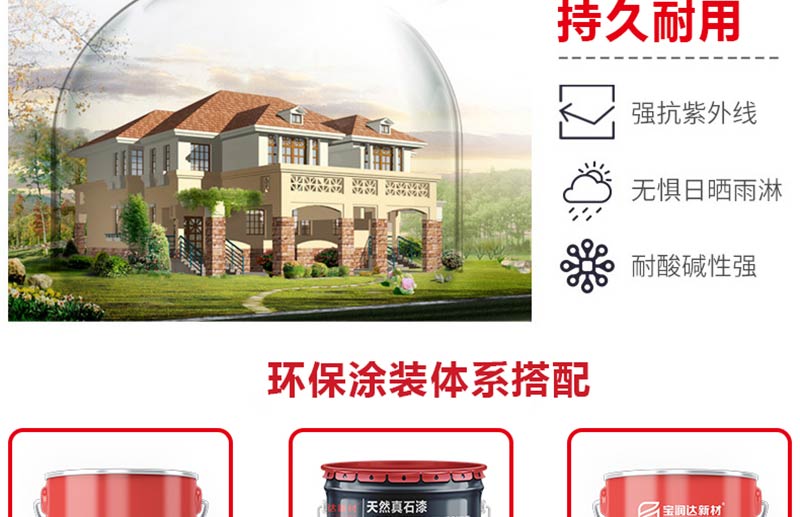 | 配套涂料 | 寶潤達(dá)抗堿封閉底漆 + 天然真石漆 + 長效鎖色罩面漆 | ||